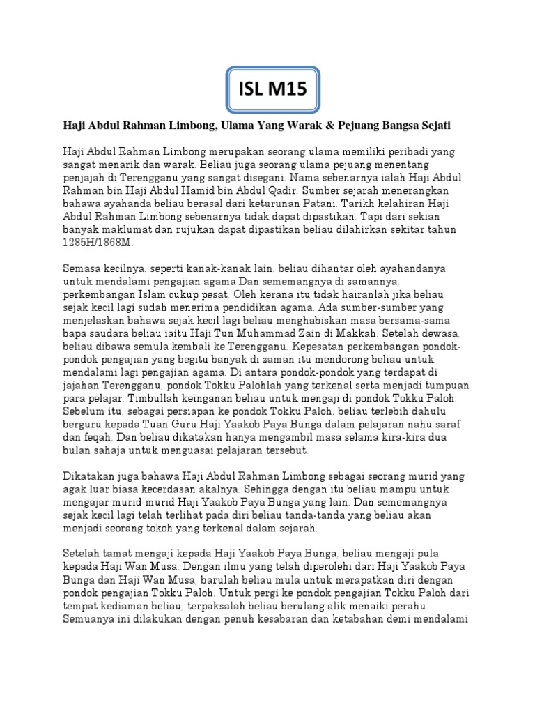 The present study investigates haji abdul rahman limbong's struggle with a focus on three objectives. Haji abdul rahman bin haji abdul hamid (—1929) was an ulema, known as haji abdul rahman limbong because he visited limbong, kemaman to teach islam and start trading. Haji abdul rahman bin haji abdul hamid (1868—1929) was an ulema, known as haji abdul rahman limbong because he visited limbong, kemaman to teach islam and start trading. B) pada tahun 1992, haji abdul rahman limbong bertindak sebagai peguam untuk membela peeteani di kuala telemong yang ditangkap kerana pihak british telah melancarkan serangan dan haji abdul rahman limbong telah ditangkap. Alhamdulilah 12 hari bulan 6 (jumaat) surau limbong akan buke. Datuk neneknya berasal dari patani dan terengganu. Firstly, he defended the rights of the settlers and. Ptti sains spm penambahan penolakan cahaya warna. Mendapat gelaran limbong kerana beliau sering mengajar agama di limbong, kemaman, terengganu. Perjuangan haji abdul rahman limbong dikenali sebagai kebangkitan tani kerana perjuangannya membela nasib petani yang ditindas. Haji abdul rahman limbong yang dilahirkan pada tahun 1868 turut dikenali sebagai tok limbong dan haji derahman limbong merupakan anak jati terengganu yang dilahirkan di kampung jenguk tong, beladau kolam, kuala terengganu. British had regarded him as a rebel. Haji abdul rahman bin haji abdul hamid (1868—1929) was an ulema, known as haji abdul rahman limbong because he visited limbong, kemaman to teach islam and start trading.